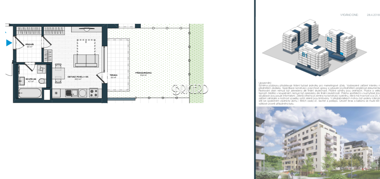 Компания BRIGERD предлагает квартиру-студию (1+кк) 32м² с террасой и палисадником (27м²) в жилом комплексе «Суоми Глоубетин» район Прага 9 - Глоубетин. В стоимость недвижимости входит также кладовка. Квартира расположена на 1 этаже 7-и этажного здания с лифтом. Окончание строительства лето 2020 г. Есть возможность выбрать материалы отделки до января 2019, которые представлены застройщиком. Весьма грамотная планировка квартиры с выделением мест для встроенной мебели (кухня, шкафы).