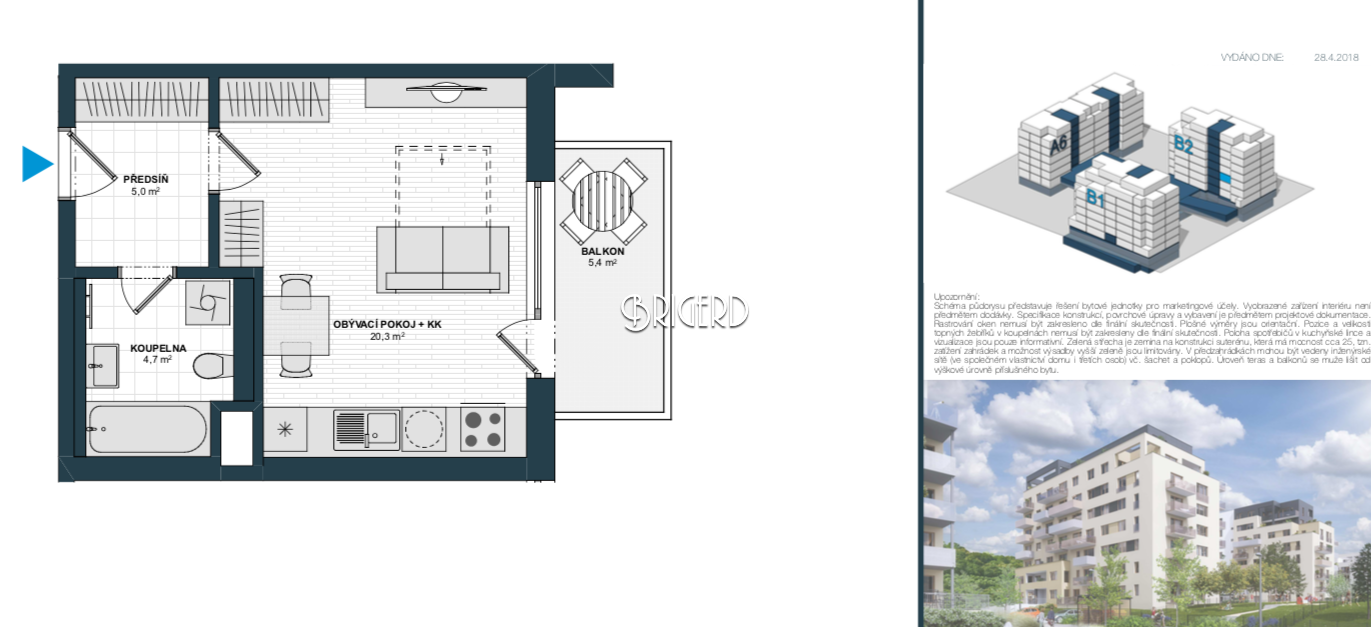 Компания BRIGERD предлагает квартиру-студию (1+кк) 32м² с балконом (5,4м²) в жилом комплексе «Суоми Глоубетин» в районе Праги 9 - Глоубетин. В стоимость недвижимости входит также кладовка. Квартира расположена на 3 этаже 7-этажного здания с лифтом. Окончание строительства запланировано на лето 2020 г. Есть возможность выбрать материалы отделки до января 2019, которые представляются застройщиком. Весьма грамотная планировка квартиры с возможностью установки встроенной мебели (кухня, шкафы).