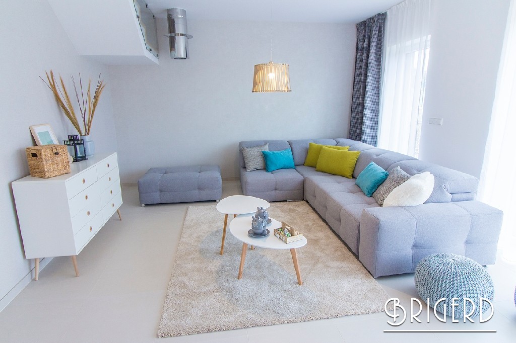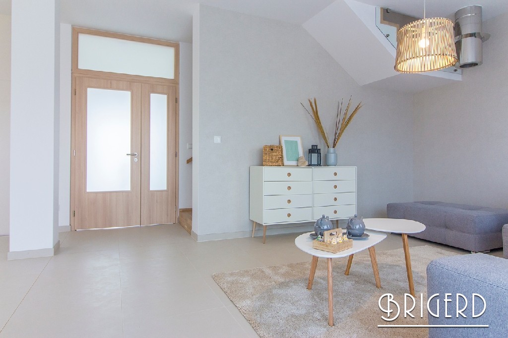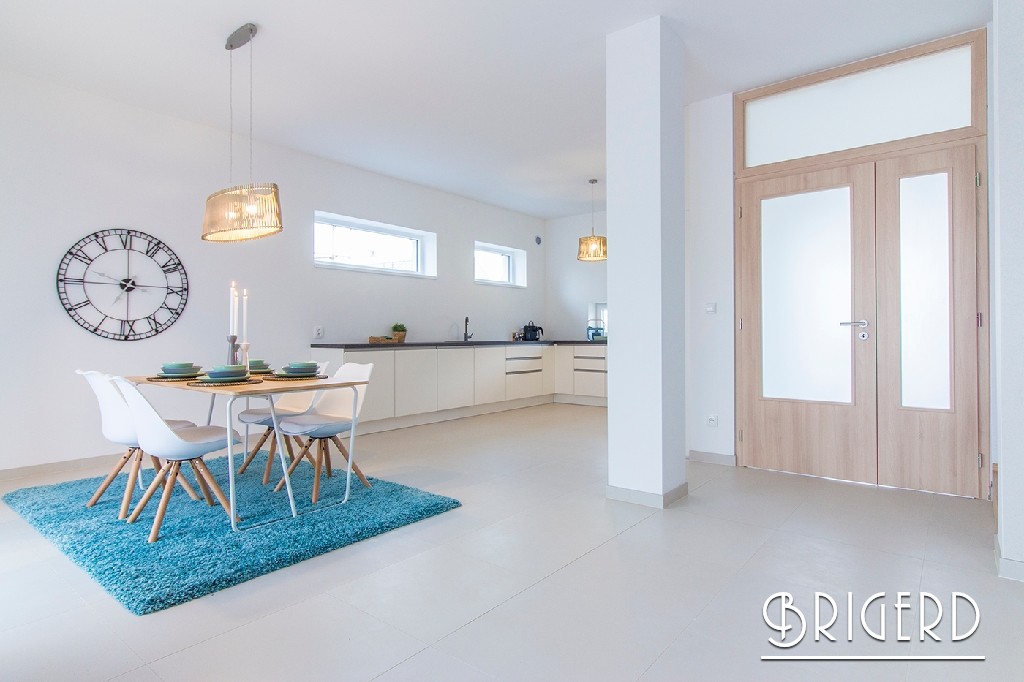 Компания Brigerd предлагает на продажу двухэтажный таунхаус с планировкой 4+кк и площадью 130м2, находящийся на участке размером 580м2. Таунхаус является частью так называемого «двойдома» - таунхауса на две семьи с двумя отдельными входами и участками. Дом был построен в рамках проекта «Синий платан». Госприемка запланирована на осень 2018 года.