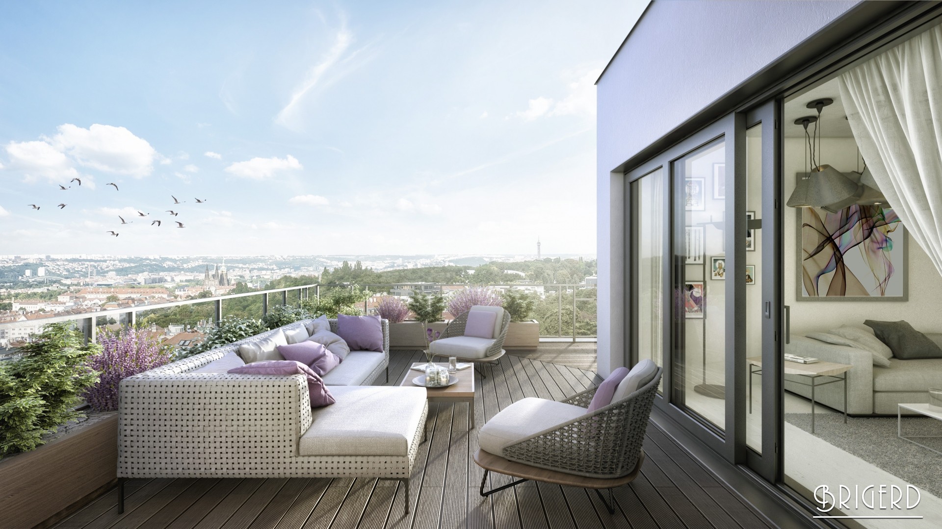 Компания BRIGERD предлагает квартиру 5+кк площадью 222м2 с 3 парковочными местами, 14-метровой кладовкой и двумя балконами на 2 этаже таунхауса в резиденции La Crone (Praha 6 – Ladronka).