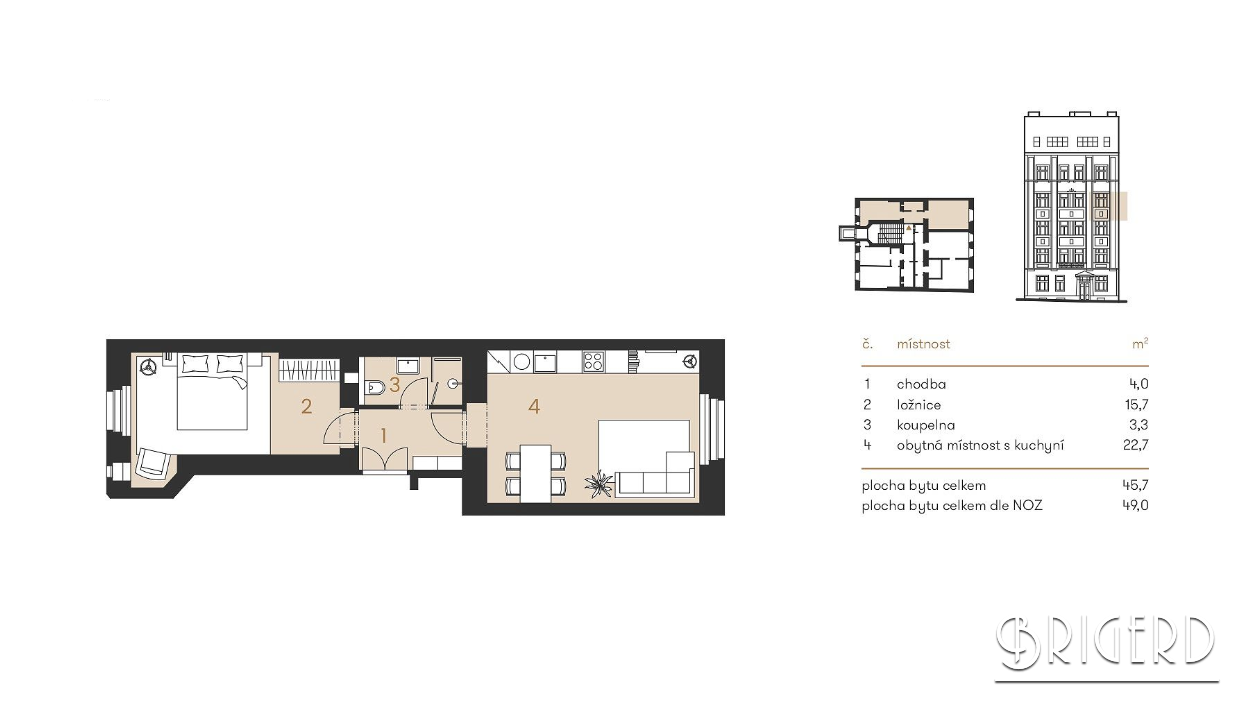 Агентство недвижимости Brigerd предлагает на продажу квартиру 2+кк площадью 49 м2 на 4 этаже нового уникального проекта в центре Праги – Резиденция «Орелска». Окна гостиной выходят на улицу, окна спальни – в зеленый внутренний двор, предназначенный для жителей дома.