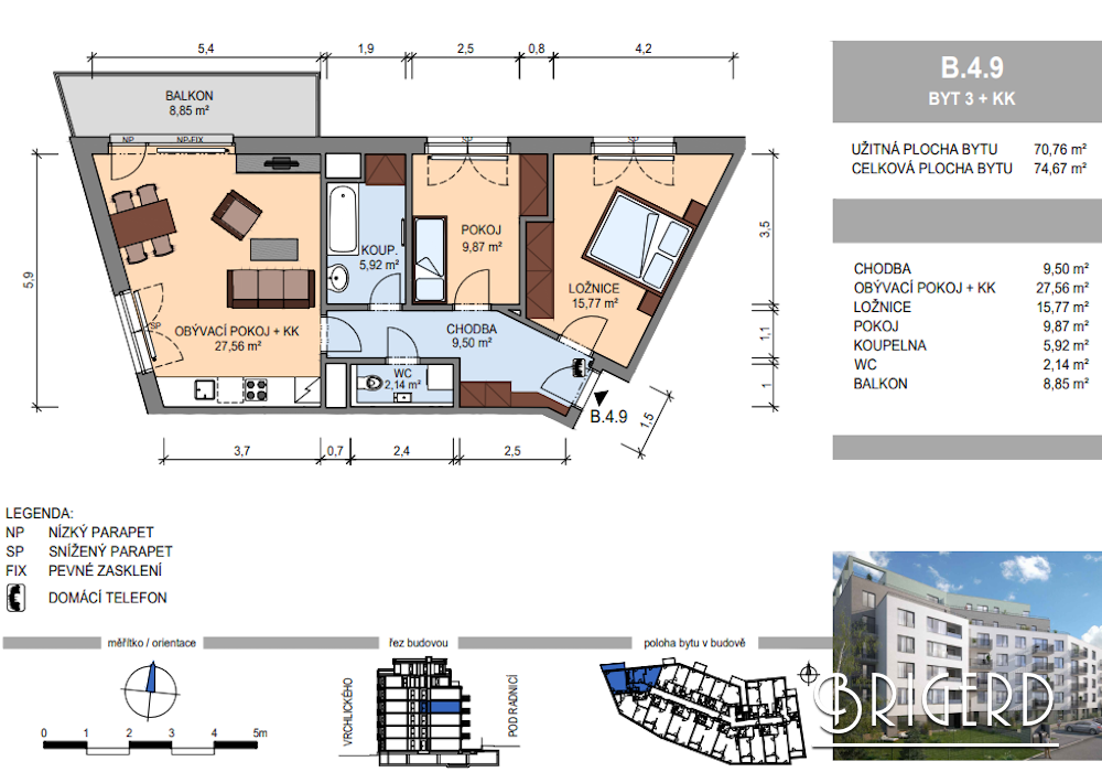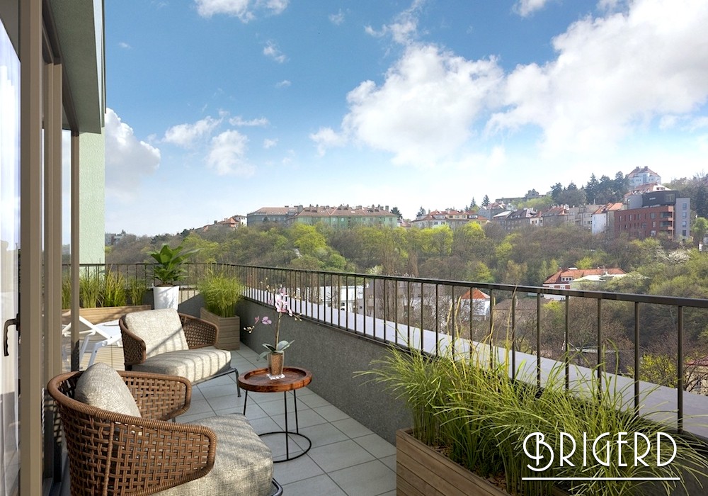 Компания ВRIGERD предлагает трехкомнатную квартиру (3 + kk) площадью 74,7m², расположенную на 4 этаже Резиденции «Врхлицкого» в районе Смихов - Прага 5. Квартира состоит из прихожей (9,5 m²), спальни (15,77 m²), ванной комнаты (5,92 m²), туалета (2,14 m²), гостиной с кухонным уголком (27,56 m²) и выходом на балкон (8,85 m²), детской комнаты (9,87 m²).