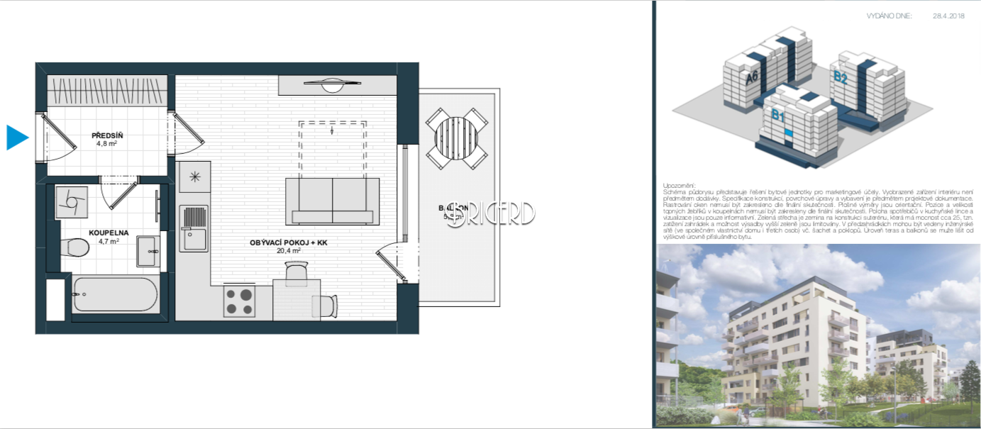Компания BRIGERD предлагает квартиру-студию (1+кк) 32м² с балконом (5,4м²) в жилом комплексе «Суоми Глоубетин» район Прага 9 - Глоубетин. В стоимость недвижимости входит также кладовка. Квартира расположена на 3 этаже 7-и этажного здания с лифтом. Окончание строительства лето 2020 г. Есть возможность выбрать материалы отделки до января 2019, которые представлены застройщиком. Весьма грамотная планировка квартиры с выделением мест для встроенной мебели (кухня, шкафы).