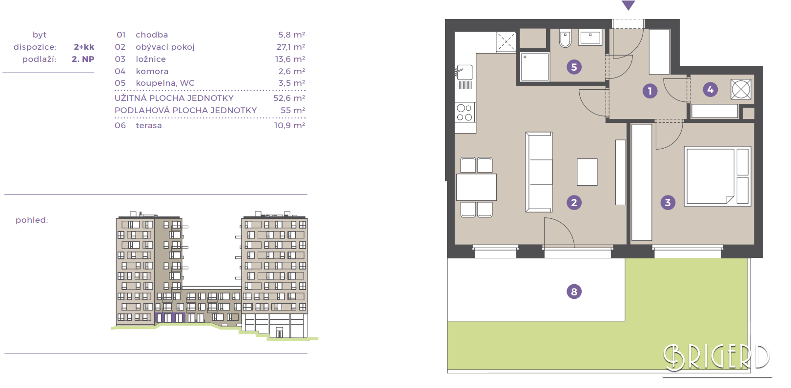 Компания Brigerd предлагает на продажу двухкомнатную квартиру (2+кк) площадью 50 м2, на 2-м этаже нового жилого комплекса «Люкс» в пражском районе Просек.