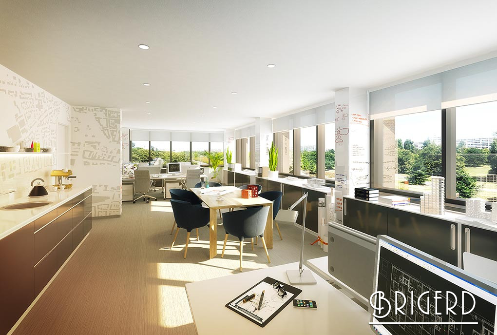 Квартира состоит из прихожей (5,8 м2), гостиной с кухонным уголком (27,1 м2), спальни (13,6 м2), ванной комнаты (3,5 м2), кладовой комнаты (2,6 м2) и 11-метровой террасы, окруженной зеленым газоном.