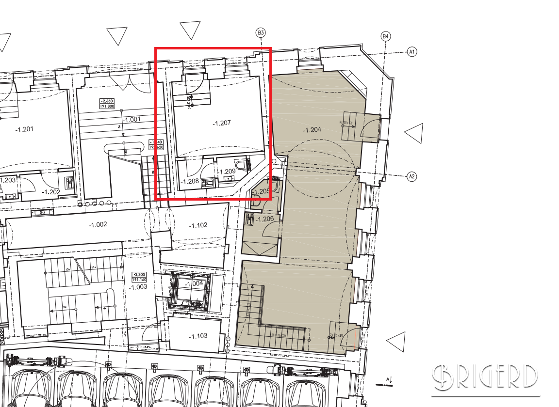 Помещение предлагает открытую планировку с двумя входоми и большими окнами, выходящими на улицу Малатова (Malátova), мини-кухню и туалет. Во дворе и в части цокольного этажа дома будет размещена автоматическая система парковки на 13 автомобилей, в общих помещениях будут расположены места для хранения вещей.